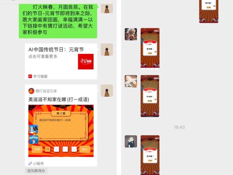 2月11日,八公司黨支部聯合太原城建工程有限公司黨支部、租賃公司黨支部、安裝公司黨支部、物業公司黨支部分別開展線上猜燈謎活動。謎題豐富多樣,涵蓋文化、體育、娛樂、年俗及筑路機械專業知識等多個領域,不僅讓職工在猜謎中深切感受了傳統節日的獨特魅力,還鍛煉了大家的思維能力和概括能力,營造出歡樂祥和、團圓幸福的濃厚氛圍。
