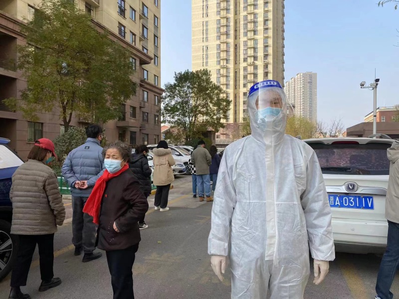 11月21日,辰宇公司董志超、李心貝、張維州、段曉娟、郭亞生等黨員職工就地轉崗,向社區報到,積極投身疫情防控的各項工作中,他們有的穿著白色防護服,有的穿著志愿者紅馬甲,協助維持秩序,負責采集信息,他們工作認真,耐心細致,積極配合社區人員開展工作,得到了社區居民的肯定和表揚。