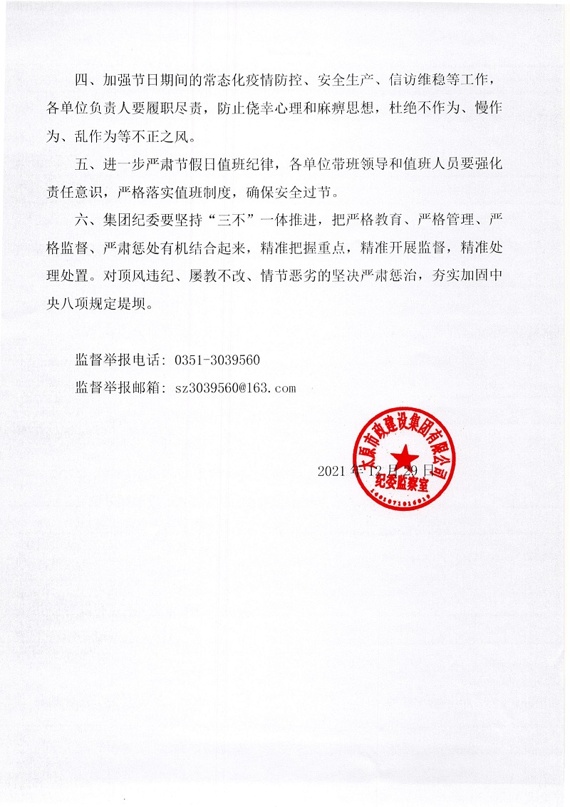 太原市政建設集團有限公司關于做好2022年元旦春節期間正風肅紀工作的通知