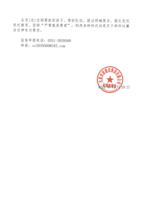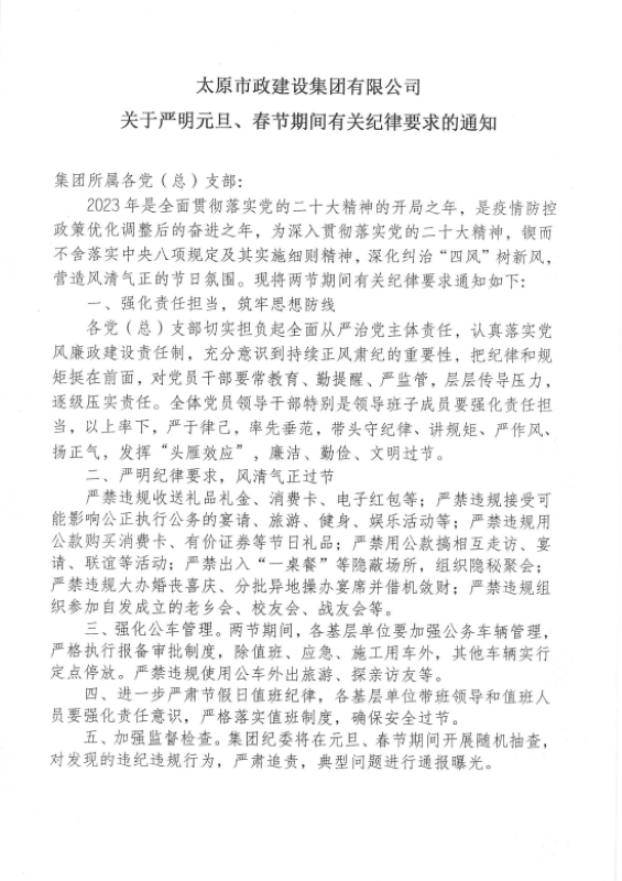 太原市政建設集團有限公司關于嚴明元旦、春節期間有關紀律要求的通知
