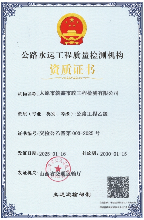 近日,筑鑫公司成功獲得公路水運工程質量檢測機構“公路工程乙級”資質證書。此次資質升級,不僅是對筑鑫公司在公路工程檢測領域專業實力的有力證明,更是其實現跨領域發展的重要里程碑,意味著下一步能夠為公路工程建設提供更多維度、更具專業性與精準度的檢測服務。