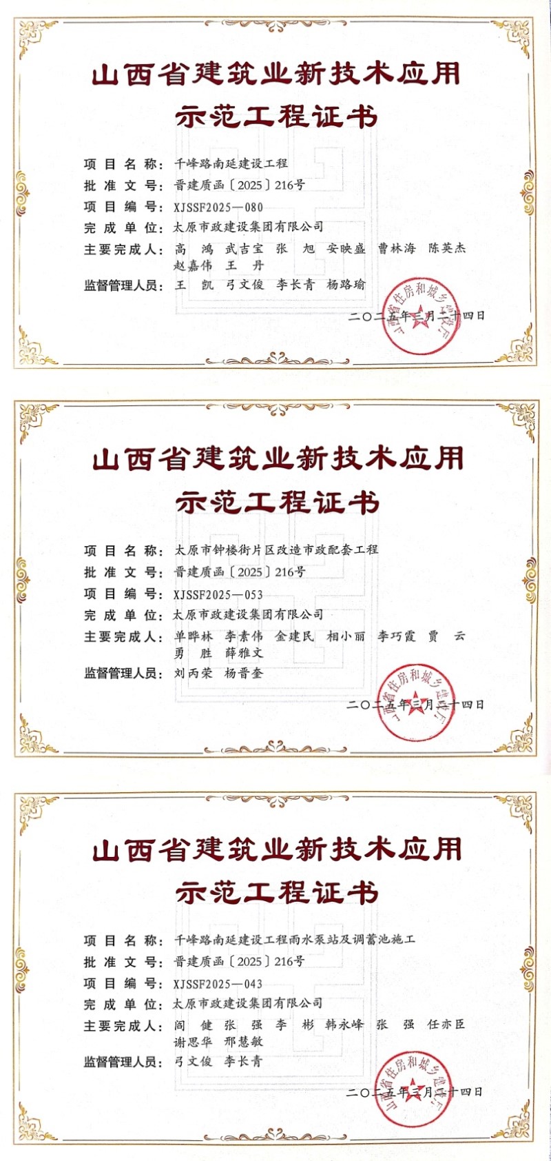 簡訊一:近日,由集團公司承建的千峰路南延建設工程雨水泵站及調蓄池施工、太原市鐘樓街片區改造市政配套工程、千峰路南延建設工程被山西省住房和城鄉建設廳評為“山西省新技術應用示范工程”。