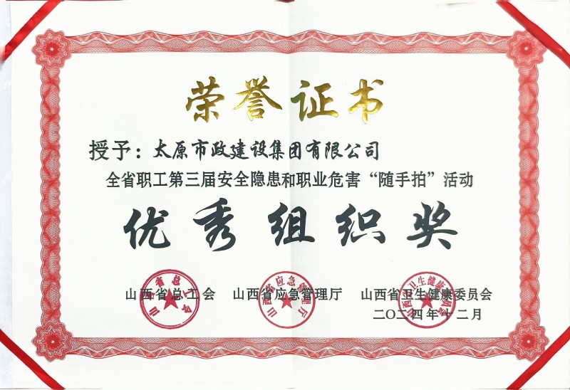 太原市政集團被山西省總工會、山西省應急廳、山西省衛生健康委員會授予全省職工第三屆安全隱患和職業危害“隨手拍”活動優秀組織獎,其中三名職工的“隨手拍”作品獲得優秀獎。