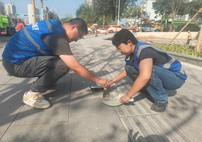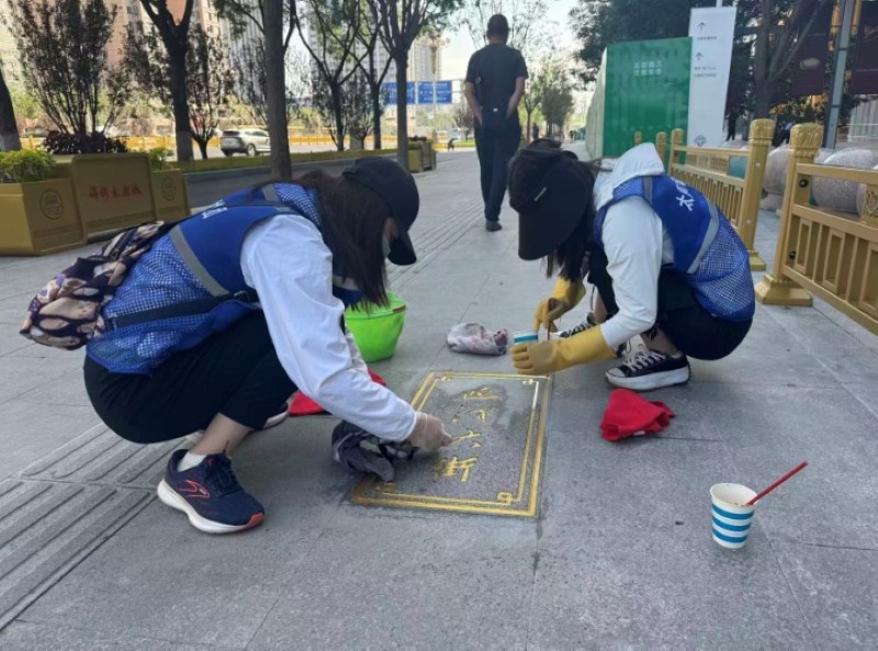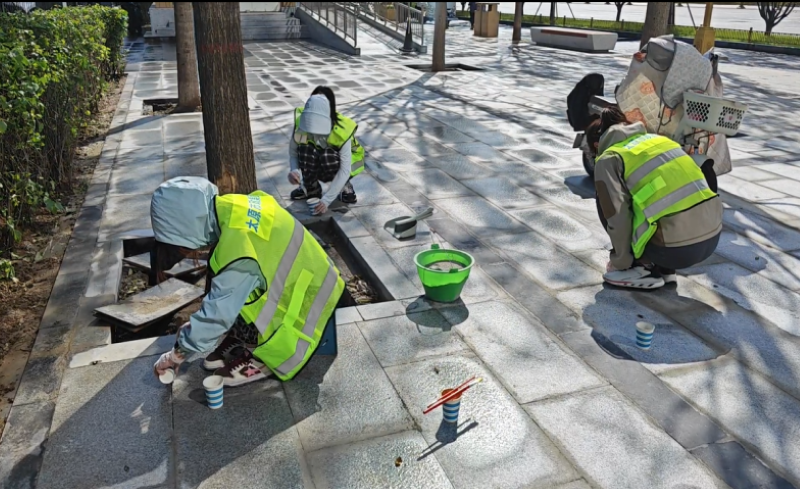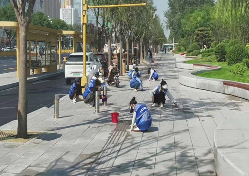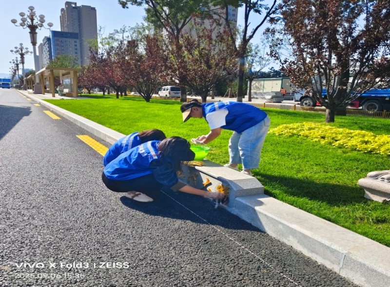 活動自9月4日起為期六天,覆蓋迎澤大街(西段)全線,重點圍繞附屬設施清潔與道路精細化維護展開?;顒又?,身著統一藍色“太原市政集團”馬甲的志愿者們,手持長柄擦洗器、水桶、抹布、鏟刀、掃帚等工具,對道路兩側公交站臺、路燈基地、護欄、照明燈桿等設施進行系統清理與擦洗;同步推進地磚灌縫精細化維護作業,通過專業操作,確保每一條裂縫都“嚴絲合縫”,有效提升路面耐用性與通行舒適度,以實際行動為市民出行安全與舒適保駕護航;同時,志愿者專門對道路沿線的石頭字景觀展開描金作業,細刷蘸取金色涂料,一筆一畫精心描摹,成為主干道上一道兼具文化氣息與視覺美感的獨特風景。