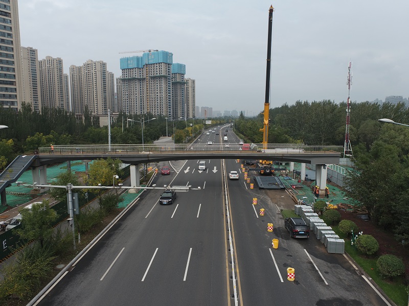 十項目部承建的北中環森林公園人行天橋主橋長度為93.8米,必須進行分段吊裝。10月8日,項目部協調多臺500噸吊車進場,在不影響車輛正常通行的情況下,利用夜間時間加緊進行吊裝。同時,因時間緊,任務重,在灌注樁施工中,項目部全體參建人員精心配合、各司其職,人材機各方面緊密配合,確保按計劃時間節點完成每日工作量,為日后主橋吊裝作業節省出更多寶貴時間。截至目前,承建的三座人行天橋鋼箱梁主體結構已全部完成。北中環森林公園南門人行天橋兩側欄桿安裝和主橋大理石鋪裝已完成,正在進行南北兩側梯道坡道欄桿安裝和大理石鋪裝;濱河西路市圖書館北側人行天橋西側坡道吊裝已完成,下一步將進行東側坡道吊裝、橋面鋪裝及護欄安裝;濱河西路三給街口人行天橋兩側梯坡道已吊裝完成,下一步將進行梯坡道安裝和主橋大理石鋪裝。