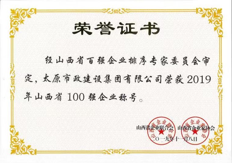 集團公司榮獲“2019年山西省100強企業”稱號,排名第39位。集團公司將持續深入踐行“以質量求生存、靠誠信促發展”的經營理念,增強發展信心,化挑戰為機遇,在爭創一流企業的道路上不斷取得新的成就,為實現我省經濟持續健康發展和全面建成小康社會做出新的貢獻。
