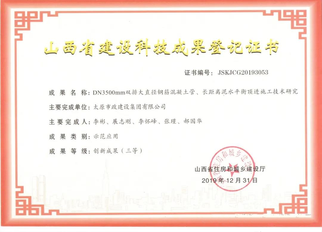 近日,集團公司申報的《DND3500mm雙排大直徑鋼筋混凝土管、長距離泥水平衡頂進施工技術研究》被山西省住房和城鄉建設廳評為創新成果(三等)。