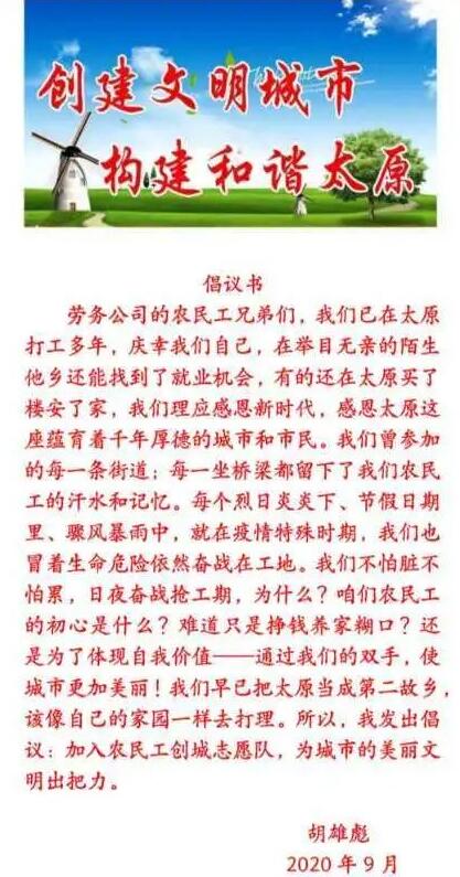 自太原市開展創城活動以來,太原市政集團聚興勞務公司農民工、全國五一勞動獎章獲得者胡雄彪第一時間向集團公司3600余名農民工發出倡議,鼓勵大家加入并組建一支農民工志愿服務隊,為太原創建全國文明城市出把力。